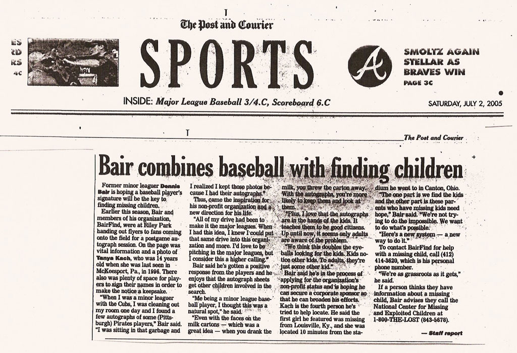 Bair combines baseball with finding children00On July 2, 2005August 8, 2015By JonathanIn Media NewsTags BairFind Autograph Session, Charleston Post and Courier, Charleston RiverDogs, Riley Park By Staff, Charleston Post and Courier Saturday, July 2, 2005 Click below for full article.